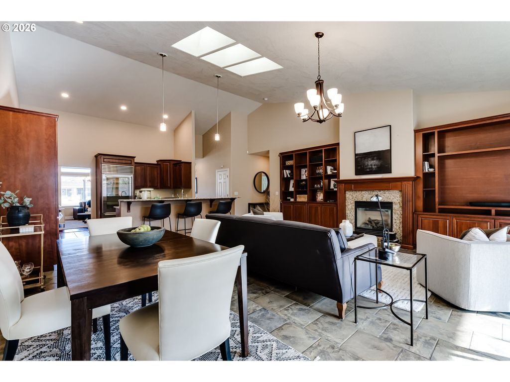 The kitchen is the heart of this house. Trimmed out with a 6 burner Wolf range and double oven, a SubZero refrigerator and a Miele dishwasher it also features ample storage and counter space. The island is home to the sink and dishwasher and a large eating bar. Granite slab countertops throughout. The one level floor plan is comfortable and efficient without feeling cramped. The ceilings are 9 feet high except where they're vaulted or trayed and are highlighted by skylights. The living room has expansive bookcases and a built in media center. The HVAC was recently replaced and the carpet and pad is brand new. Situated next to Emerald Valley Golf Course the 3 car garage is likely to come in handy! The community is extremely walkable and provides athletic courts and common space. This lovely and comfortable home eagerly awaits its next stewards.