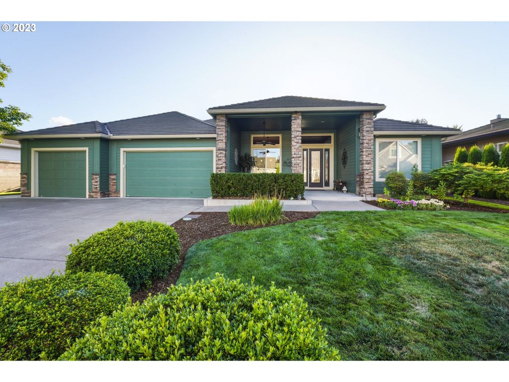 Make 2024 your best year in this beautiful home! Stunning, custom and single level home in the Emerald Valley Golf Course community. A welcoming large covered outdoor living space w/entry through the beautiful leaded glass brings you into the spacious great room style floor plan that would appeal to the entertainer side of you. Includes formal/informal dining areas as well as lg eating bar. Master bedroom is on the opposite side of the home from the 2 guest bedroom suites. Features include high ceilings, wall of windows, double sided gas fireplace, office nook, B/I Vac system, hardwood flooring and magazine worthy upgrades. The kitchen is complete with cherry cabinets, pantry, wine fridge, Bosch dishwasher, Dacor 6 burner gas range w/hood, double oven and stainless steel fridge. Large island w/granite counters & eating bar with room for 6! The master suite with coffered ceiling has its own gas fireplace, huge walk in closet, bathroom w/double sinks, jetted tub, glass block accents, huge walk in shower, and access to the covered patio in the backyard complete with hot tub. Covered back patio has built in speakers, ceiling fans and water feature too. So much storage inside as well as in the oversized 3 car garage, plus pull down attic access. Community includes tennis courts for your use too! It's love at first sight with this one. You would be so lucky to call this amazing house your home. Price reduced!!