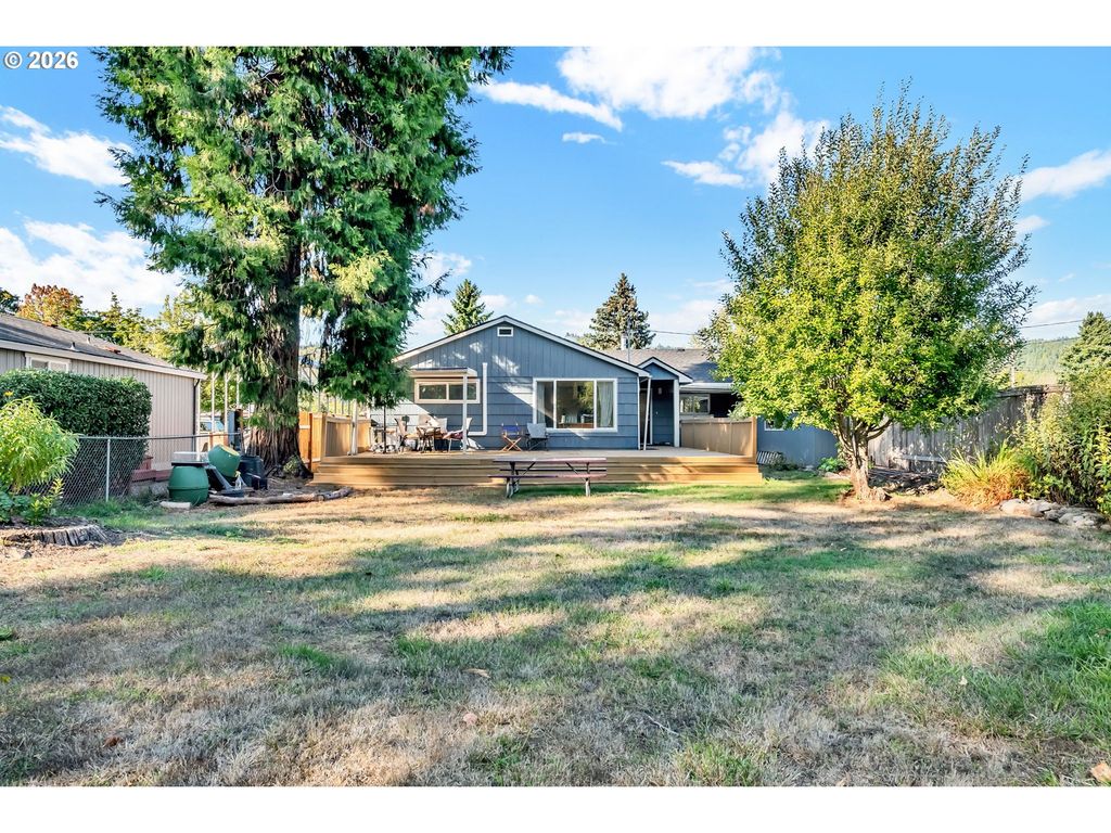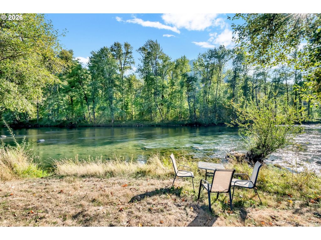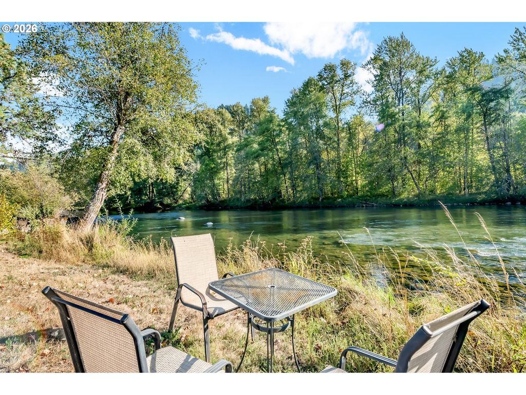 Rare opportunity to own riverfront property on the Willamette River with direct access and strong appeal for recreation or vacation rental use. Located in Oakridge, known for its extensive network of world class mountain biking trails and sunny climate, and just 30 minutes from Willamette Pass Ski Area, this home is ideally positioned for year round adventure. The home features a comfortable, functional layout with numerous updates already completed, including roof, electrical panel, heat pumps, wood stove, windows, and flooring. The outdoor space is thoughtfully designed with established herb and vegetable gardens, raised beds, blueberries, and fruit trees, while a spacious deck overlooks the river and surrounding landscape, creating a perfect setting to relax or entertain. Additional features include ample driveway parking, a one car garage, and a versatile workshop. With its prime location and strong recreational appeal, this property also offers excellent potential as a vacation rental or Airbnb, buyer to perform due diligence.