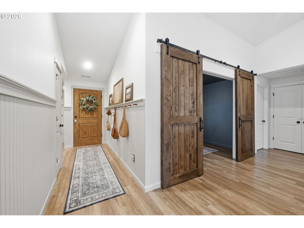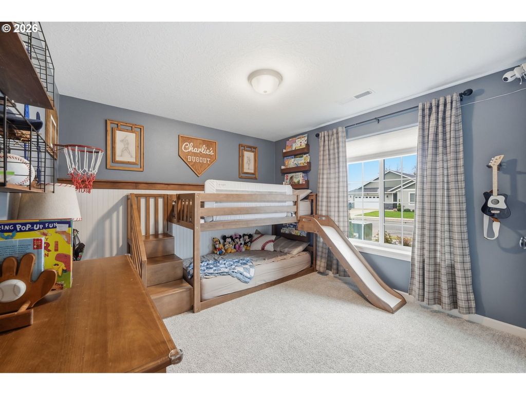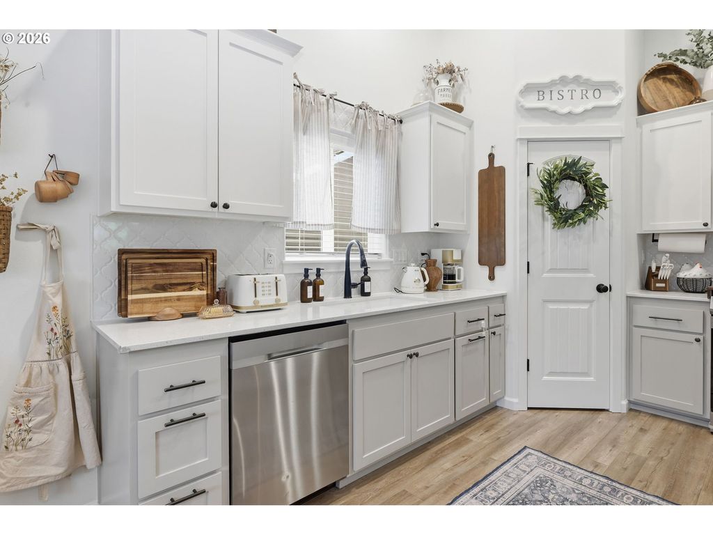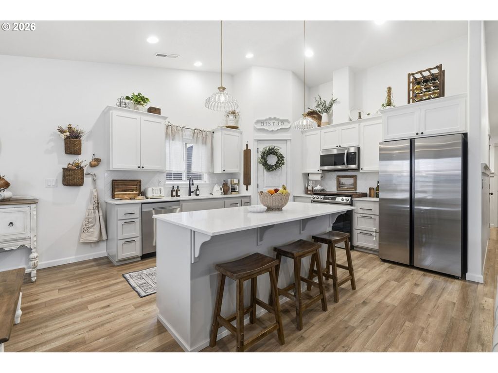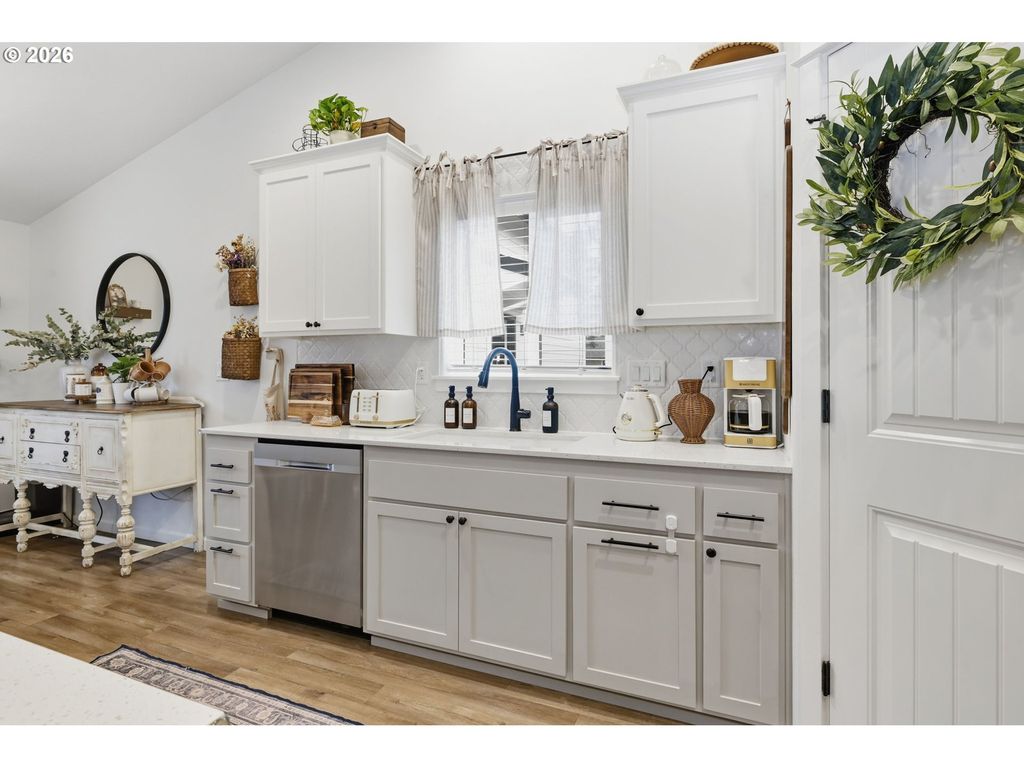 Welcome to this delightfully well-maintained home in the charming community of Creswell! Modern touches and a clean aesthetic take your breath away upon entry. The living room features soaring vaulted ceilings to drench the room with light. Off the living room, you will find a possible fourth bedroom or office space with a barn door entry, adding to the home's flexibility and functional layout. The kitchen is well-equipped with a gas range, quartz countertops, a large island, stainless steel appliances, and a handy pantry for additional organization and storage. A dedicated dining space adjacent to the living room and kitchen creates a great flow for entertaining. Three bedrooms feature cozy carpets, with the primary bedroom suite enjoying a large walk-in closet, an ensuite bathroom with dual sinks, and vaulted ceilings. Outside, you will find a beautifully landscaped backyard featuring a concrete patio, a separate sitting area for evening stargazing, a dedicated garden space, and a play structure.