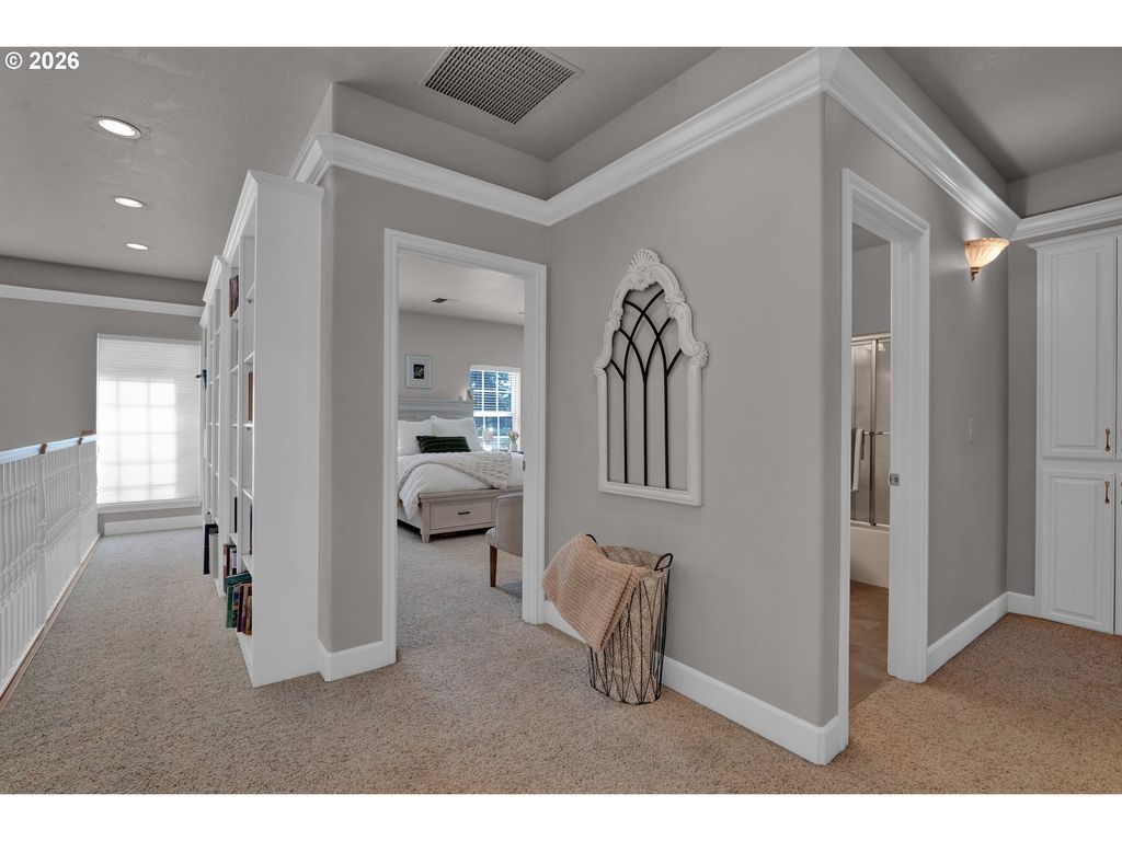 Refined living in the sought-after Emerald Valley Community. This beautifully updated home offers quiet, upscale living just minutes from Eugene, ideal for downsizers, retirees, or professionals seeking comfort without compromise. Light-filled interiors with soaring ceilings, large windows, and two gas fireplaces create an inviting, elegant atmosphere. The remodeled gourmet kitchen features quartz counters, a large island, and upgraded high-end SS appliances-perfect for everyday living or entertaining. Two primary suites on the main level provide flexibility for guests, while a private study offers an ideal home office. Two bedrooms upstairs and a versatile bonus room with wet bar add additional living options. Enjoy a low-maintenance backyard backing to a tranquil water feature, steps from Emerald Valley Golf Course. Oversized garage with EV charging and a dedicated golf car bay! Located in a serene, low-turnover neighborhood with easy access to I-5 and local amenities, this home is a rare opportunity for comfort, privacy, and understated luxury!