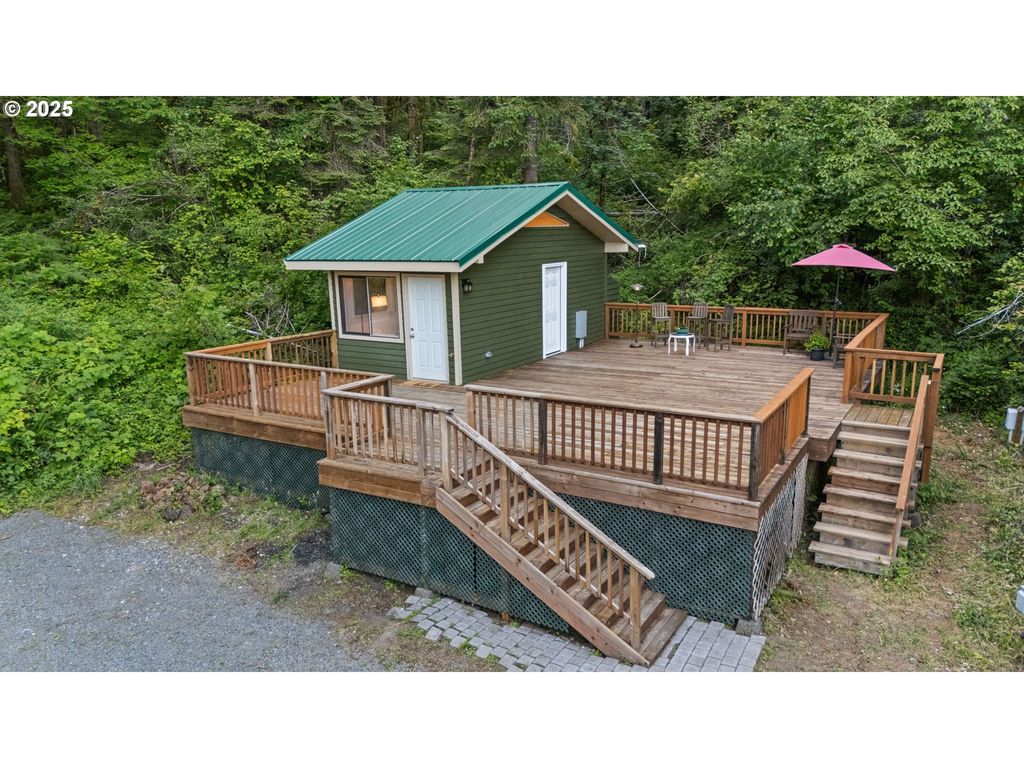 An exceptional and unique property on 10+ acres with 3-4 different living spaces; ideal for multi-generation families and/or rentals. Main house is two-round, open ceilings with skylights, connected by an octagon. 3-bedrooms, 2 baths, about 2,000 SF. Built in 1990, it's been updated in 2025 with new paint, flooring, and countertops throughout. The kitchen has brand new stainless-steel refrigerator, oven/cooktop, microwave and dishwasher. There's an abundance of counterspace, a large skylight, walk-in pantry, and built-in desk with upper wall cabinets. Off the hallway is a separate laundry room with washer-dryer; a door provides direct "mudroom" access to/from the foyer. The former llama ranch has a separate guest house with a loft plus an 850 SF deck engineered to support a yurt if desired. Another detached two-story building holds a 3-car garage below with a full 850 SF apartment above; could also be an Airbnb, or event center. There's a large workshop and barn with six stalls leading to eight pastures. Next to it is a loaf shed with three bays. Two additional RV hookups are on the property: one with a cement pad. The large garden area has 8 cement-block-raised beds, a greenhouse, and a rabbit hutch. Nearby is a small building with a loft, which could be a she-shed, he-shed, teen bedroom, or bunkhouse. And there's a large, walk-in chicken house with a small separate exterior door for egg collection made easy. The property also has mature Douglas Fir Trees and a small hilltop orchard. Water spickets are scattered throughout the land. The property entrance has a securely locked gate with wireless, remote operation. Located just 25 minutes from downtown Eugene and 10 minutes from downtown Cottage Grove. Photo 48 is a site map and shows locations of the buildings and features.
