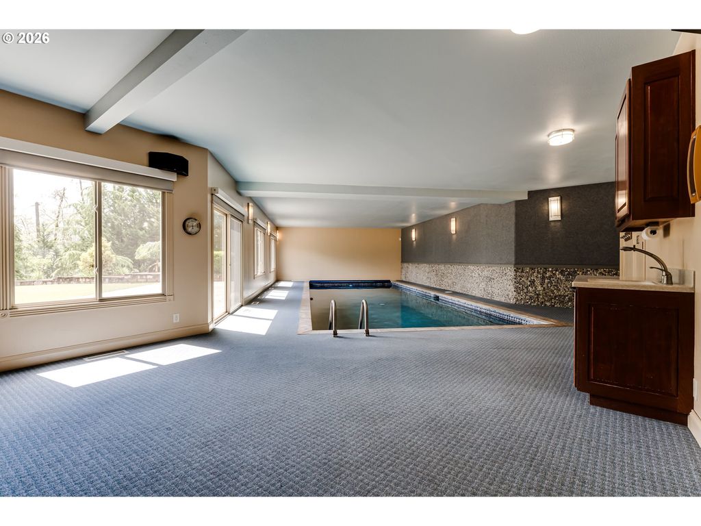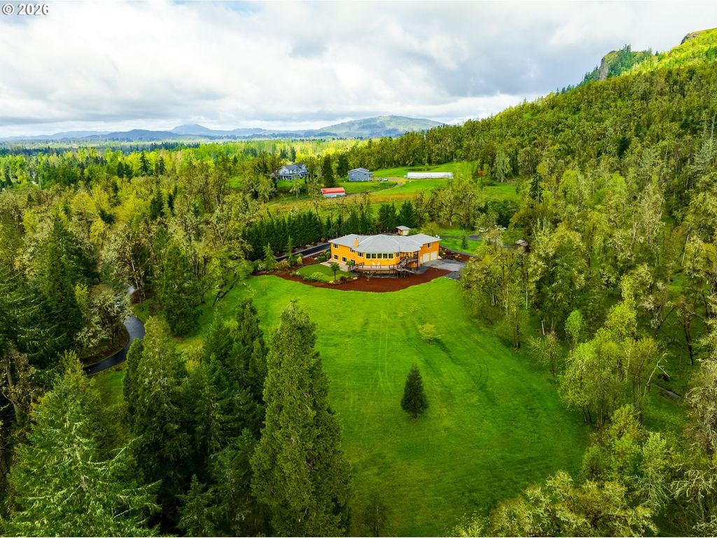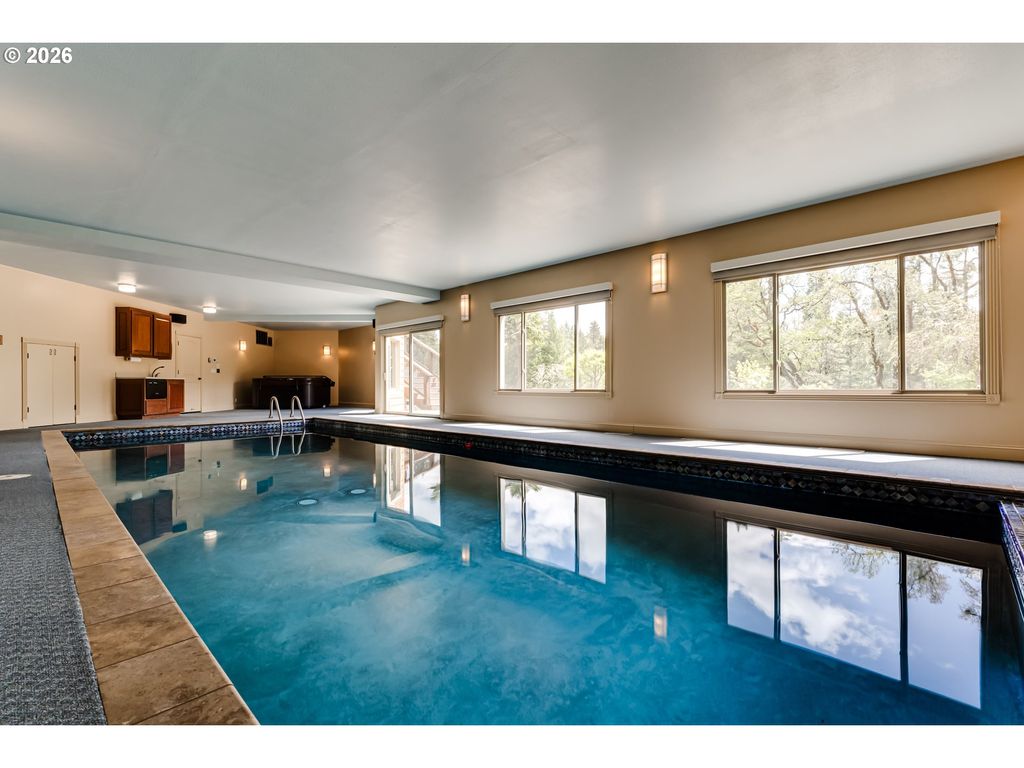 Secluded 13.29-acre estate spanning two tax lots offers privacy, beauty, and functionality. Gently rolling, usable land features mature oak trees, an orchard with cherry, apple, and peach trees, and two seasonal ponds. Meandering pathways, bridges, and benches create a park-like setting for relaxation and exploration.Outdoor living includes expansive low-maintenance composite decks for entertaining. The property offers upper and lower true two-car garages plus a detached garage for larger equipment. Ample space for tools, hobbies, vehicles, and storage is designed for ease of upkeep.The custom-built 5,417 sq ft home centers around a 36' x 14' indoor pool heated by a geothermal HVAC system, with an indoor hot tub framed by expansive windows for natural light and views. Features include an Xtrordinair fireplace with heat exchange, a gourmet kitchen with premium stainless steel appliances, and wood flooring throughout.The main level includes a primary suite with an extra-large walk-in closet and pass-through laundry, dedicated office spaces, vaulted ceilings, and oversized doorways. The lower level adds a workout room, second laundry with dog washing station, and a woodworking or hobby space suitable for multi-generational living.The pool room opens to a patio and turf yard with a putting green, raised garden beds, and mature landscaping.Additional features include two geothermal systems (home and pool), new furnace (2025), composite roof with leaf guard gutters, cement tile exterior, and a backup generator with a 250-gallon propane tank.This property combines usable acreage, infrastructure, and comfortable living for everyday use and long-term enjoyment.