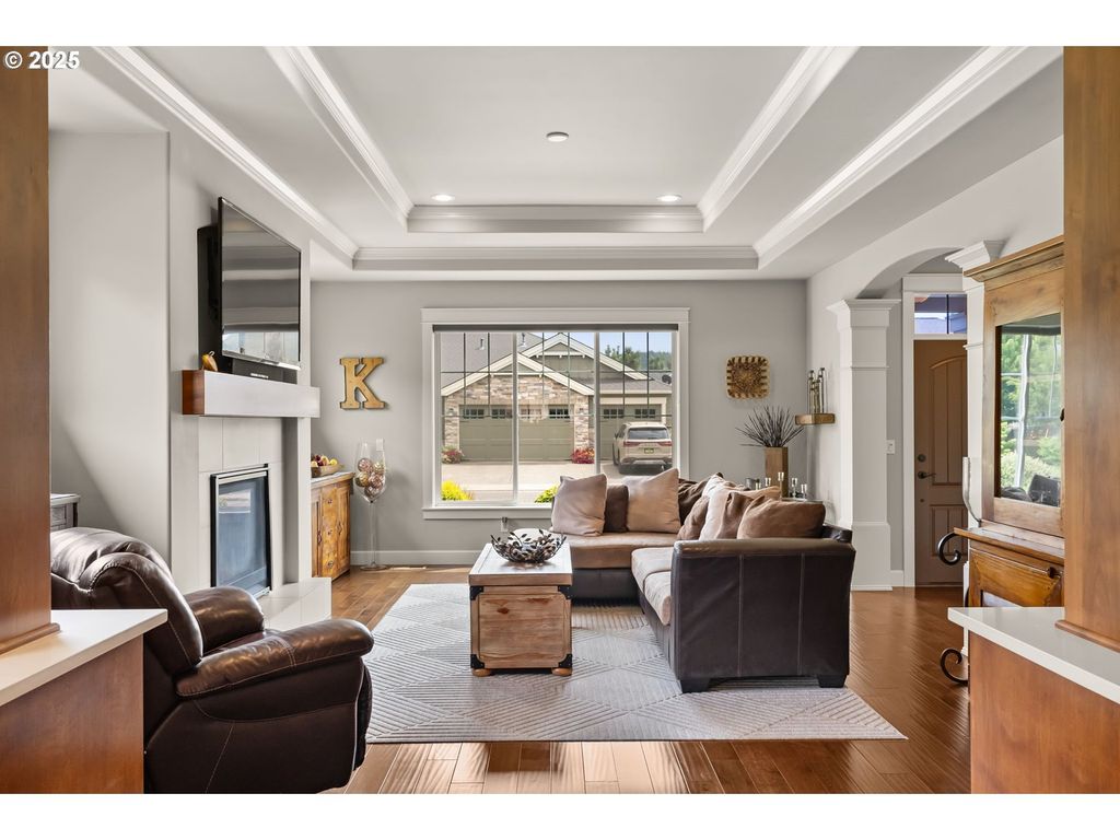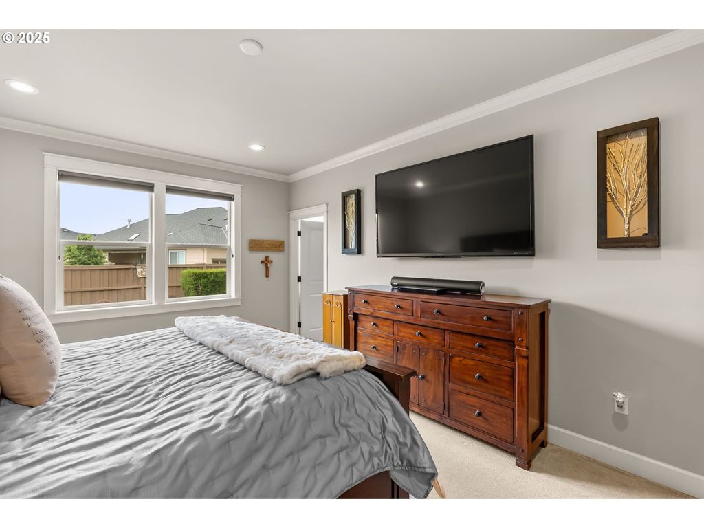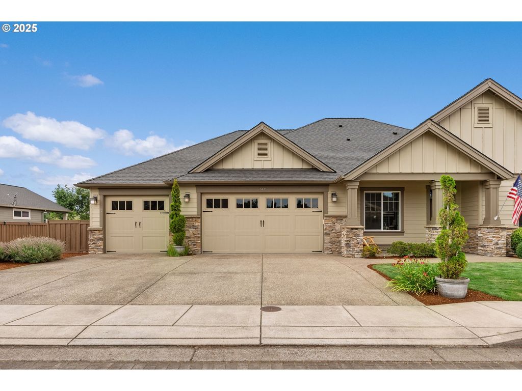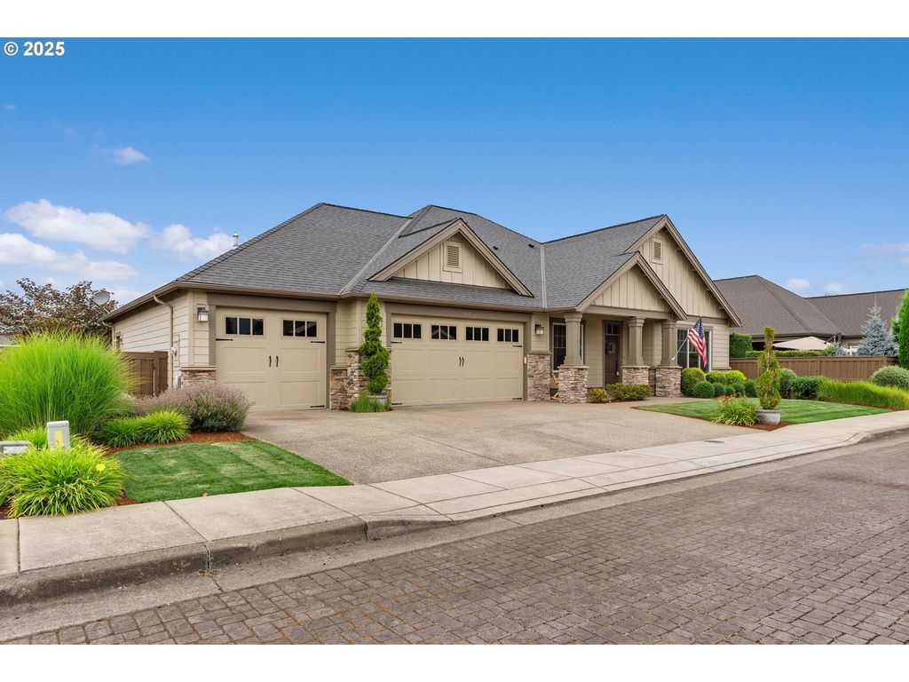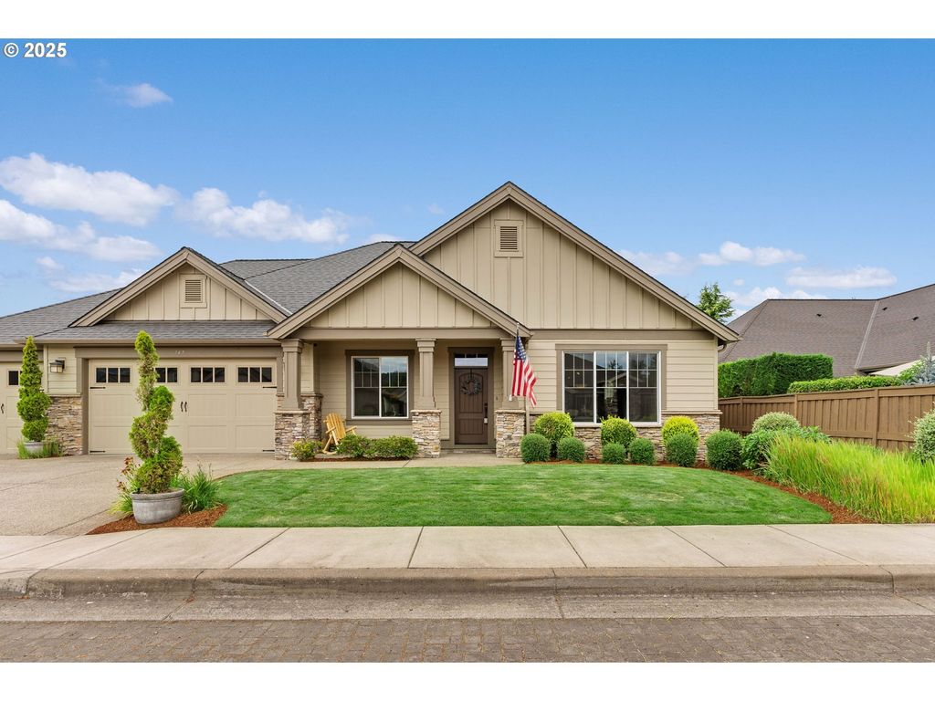 Discover The Reserve at Emerald Valley, an exceptional gated community developed by the award-winning Pahlisch Homes with a FOUR CAR GARAGE! This exclusive single-level residence exudes unmatched luxury, featuring stunning high cove ceilings, elegant wood floors, and a cozy gas fireplace. It showcases a spacious great room and an expansive kitchen equipped with quartz countertops, stainless steel appliances, an eating bar, a gas stove, a built-in microwave, and a dishwasher. The home includes four bedrooms, with the primary suite presenting a spa-like ensuite bathroom complete with double sinks, a walk-in tile shower, and a generous walk-in closet. The fenced yard, accompanied by a covered patio, is perfect for year-round entertaining. Additional features include a 4 CAR GARAGE and ample storage. Conveniently located near the Emerald Valley Golf Course and just minutes from Eugene, this home introduces "The Creighton" floor plan, offering plenty of space and comfort for any homeowner, all within walking distance to local shopping and coffee shops. Seller installed a brand new water heater as well!