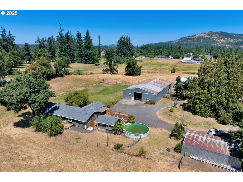 Nestled on 10 acres in the midst of serene landscape, discover this exceptional Pleasant Hill-area estate that offers a unique blend of rural tranquility and modern convenience. Located just minutes from Mount Pisgah Arboretum and Howard Buford Recreation Area, it provides endless trails perfect for riding and exploration.Currently a dog agility training center, this estate is ideally set up for horses, cattle, goats, or llamas. The well-cared-for home features a kitchen with quartz countertops and pull-out shelves, offering views of Bear Mountain. The primary suite includes a cozy electric fireplace, a walk-in closet, private bath access, a slider to the backyard, and new carpet. Its en-suite bathroom boasts a programmable heated tile floor and dual controls shower. A unique vent above the primary suite door draws heated air from living room's woodstove for efficient warmth.The inviting living room, with new carpet and a newer woodstove, offers breathtaking Mount Pisgah views. An updated main bathroom features a walk-in shower and granite countertops. The laundry room offers practical storage with pull-out drawers.The home boasts a new roof (2022), new rain guard gutters (2024), and upgraded underfloor insulation (2024).Equestrian amenities are superb: a 50x94 indoor riding arena with a tack room, a 24x24 foaling stall, two turn-out stalls, a 24x36 turn-out/stock area, an outdoor riding area, and a round pen. Additional storage and shop is found in an 84x84 barn, 1/2 of barn is set up as shop area, both barns have 220 electrical power. Plus two 24x36 garages (3bays each).The fertile grounds include fruit trees (peach, plum, cherry, pear) and a seasonal creek. Irrigation rights from the Coast Fork of the Willamette River offer potential for crops.This versatile property previously had an ADU mobile home (hardship) and can accommodate RV parking with existing hook-ups. Reserve a Showing of this Exceptional Pleasant Hill-Area Estate today!